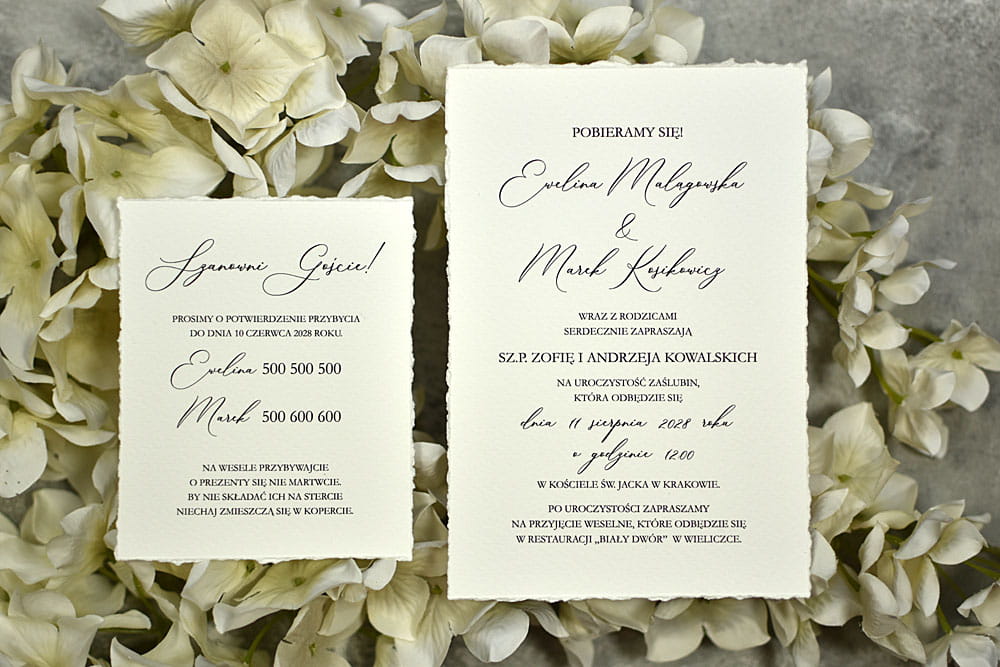 Na zdjęciach przedstawiamy jeden, ten sam wzór zaproszenia w dwóch różnych stylach, dzięki czemu można zobaczyć jak zmienia się charakter papeterii w zależności od wybranych dodatków.