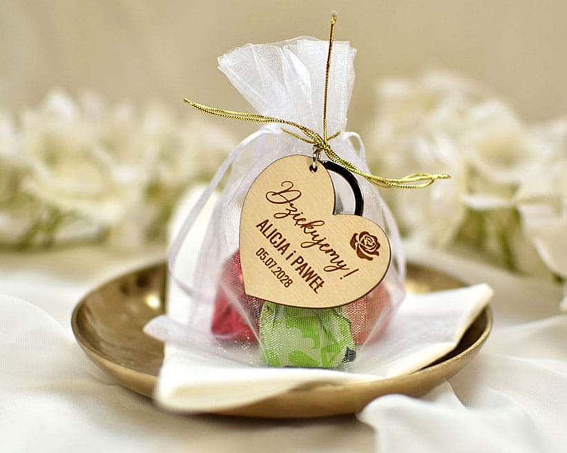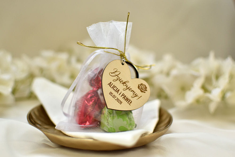 Pomysł na słodki upominek dla gości - pralinki od polskiego producenta zapakowane w elegancki woreczek z organzy. W zależności od wersji do woreczka może być dowiązany personalizowany bilecik z Twoim tekstem, a nawet pamiątkowy breloczek. Na bileciku lub na breloczku może zostać umieszczone imię gościa, dzięki czemu upominek będzie jednocześnie pełnił rolę winietki. Taki elegancki podarunek będzie się świetnie prezentował położony obok talerza.