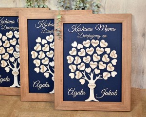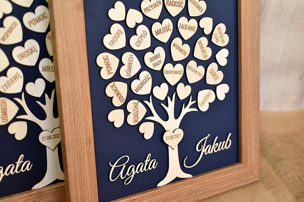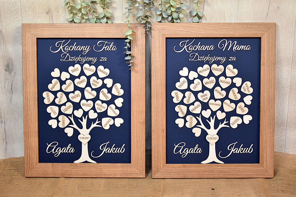Eleganckie drzewko z grawerowanymi sercami - podziękowanie dla Rodziców na weselu lub z innej okazji. Piękny obraz 3D do powieszenia na ścianie, który jednocześnie będzie pamiątką dla Rodziców w dniu ślubu. Poszczególne serduszka mają wygrawerowane napisy takie jak miłość, radość, serce - czyli wszystko, za co chcielibyście podziękować Waszym życiowym opiekunom. Ten niepowtarzalny obraz może być wykorzystany przy dowolnej uroczystości jak prezent na Złote Gody, urodziny, jubileusz, zakończenie szkoły, pracy itp., a serduszka mogą zostać przez Was także ręcznie odpowiednio opisane.