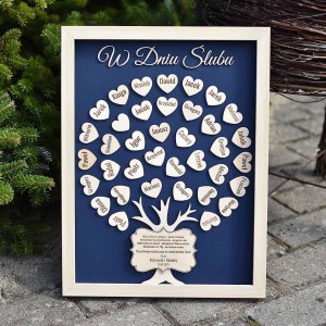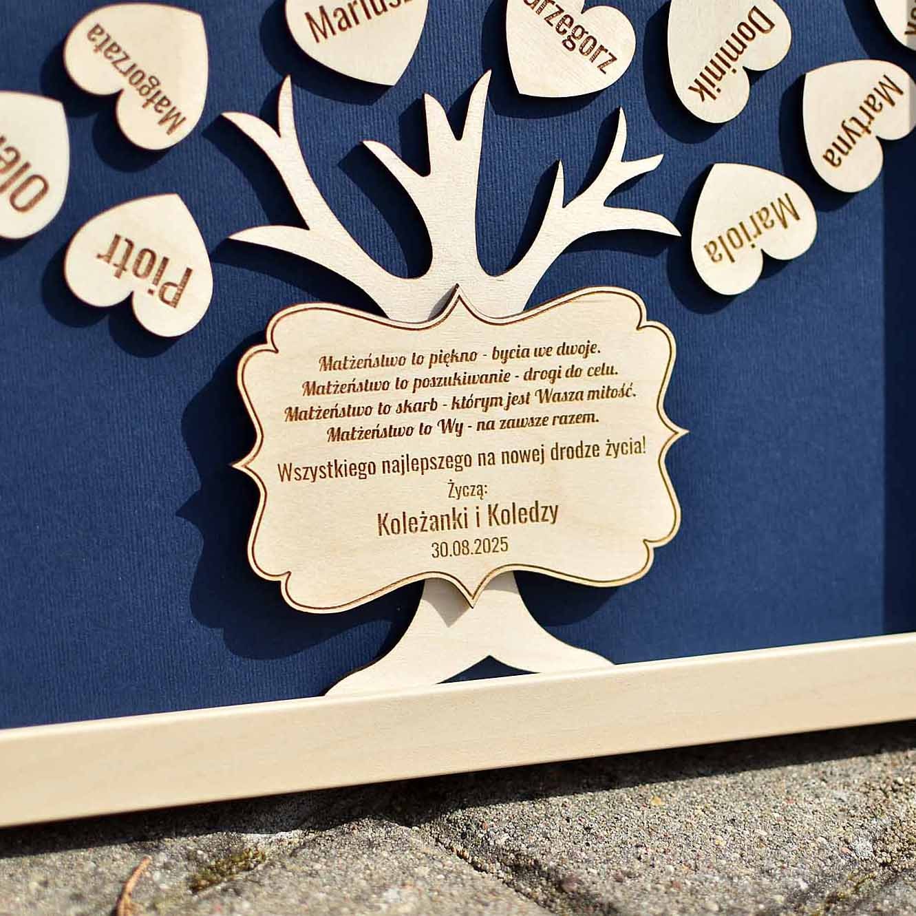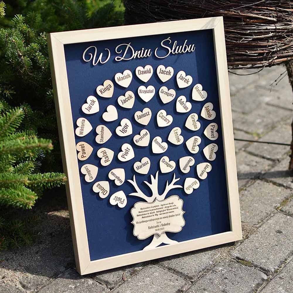 Drzewko w ramce to elegancki, drewniany obraz, który stanowi doskonałą alternatywę dla tradycyjnych kwiatów. Zamiast zwykłych liści, koronę drzewa tworzą starannie wycięte serca z imionami współpracowników. Taki upominek to trwała i wzruszająca pamiątka od delegacji z pracy, która będzie wspaniałą ozdobą wspólnego domu nowożeńców.