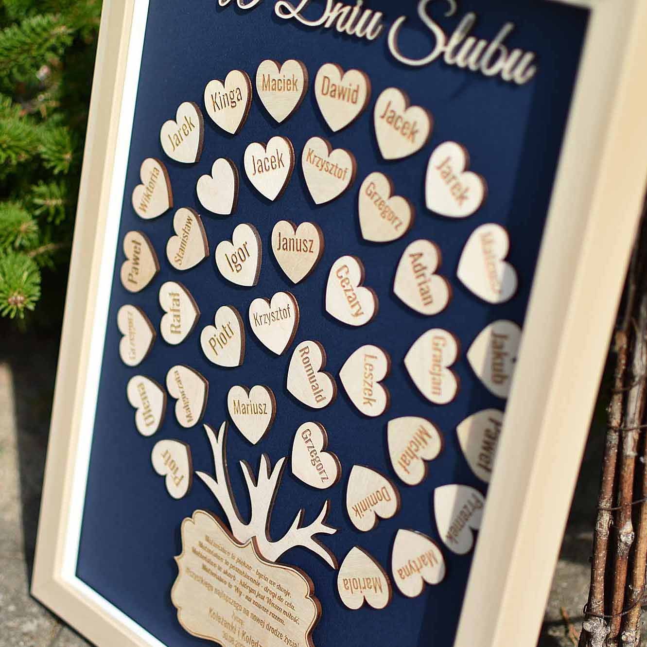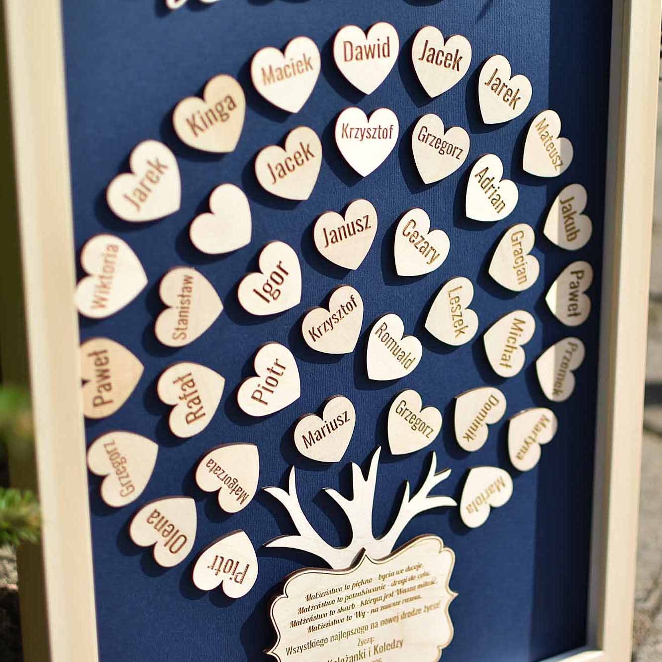 prezent ślubny dla kolegi/koleżanki w firmie, drzewko w ramce, serca z imionami współpracowników