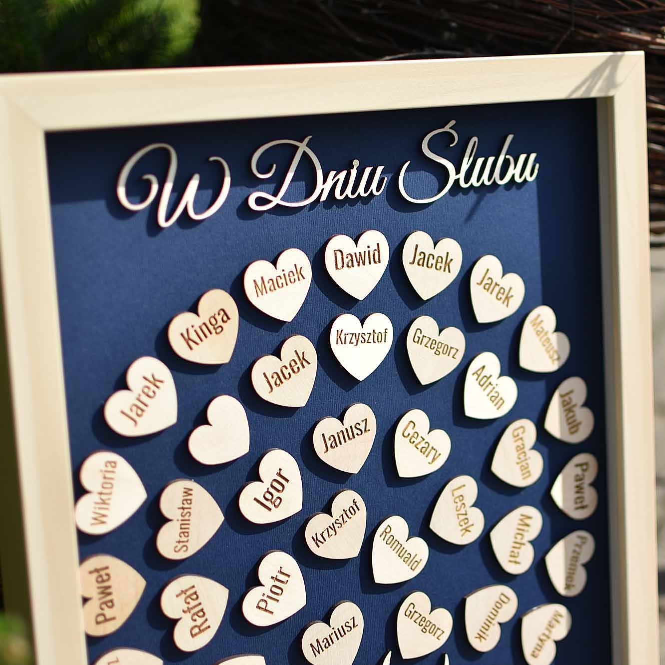 Zamiast tradycyjnych kwiatów czy standardowych upominków, podarujcie nowożeńcom coś, co zostanie z nimi na zawsze. Drewniane drzewko umieszczone w eleganckiej ramce posiada unikalną koronę – zamiast zwykłych liści, gałęzie zdobią starannie wycięte serca. Na każdym z nich widnieje wygrawerowane imię współpracownika, tworząc piękną, spersonalizowaną mozaikę Waszego zespołu. Taki gest z pewnością wywoła uśmiech i szczere wzruszenie na twarzach Młodej Pary, stając się jednocześnie wyjątkową ozdobą ich wspólnego domu.