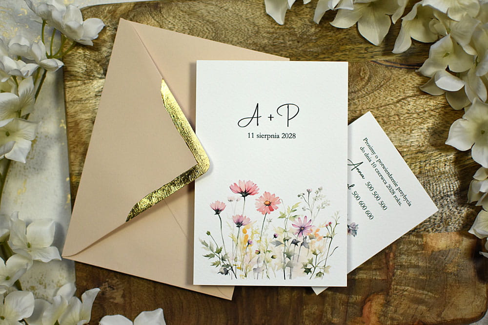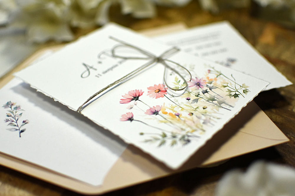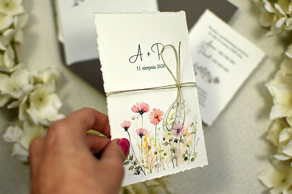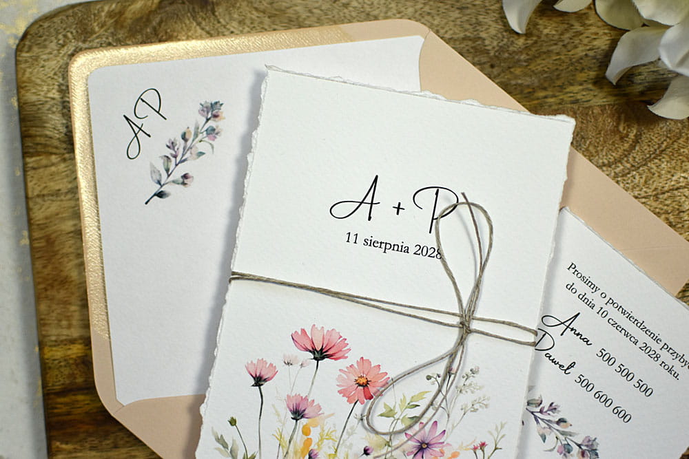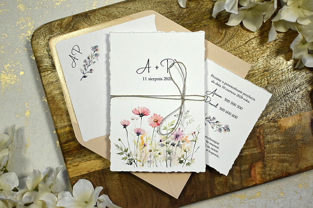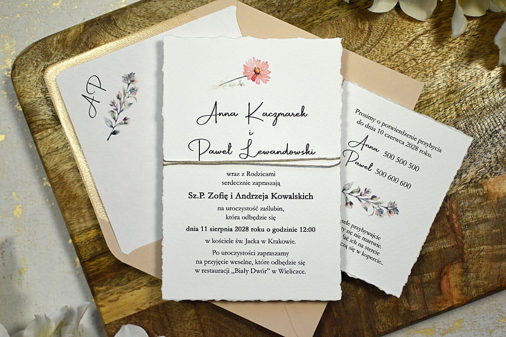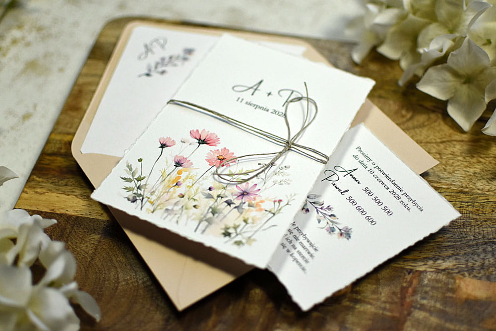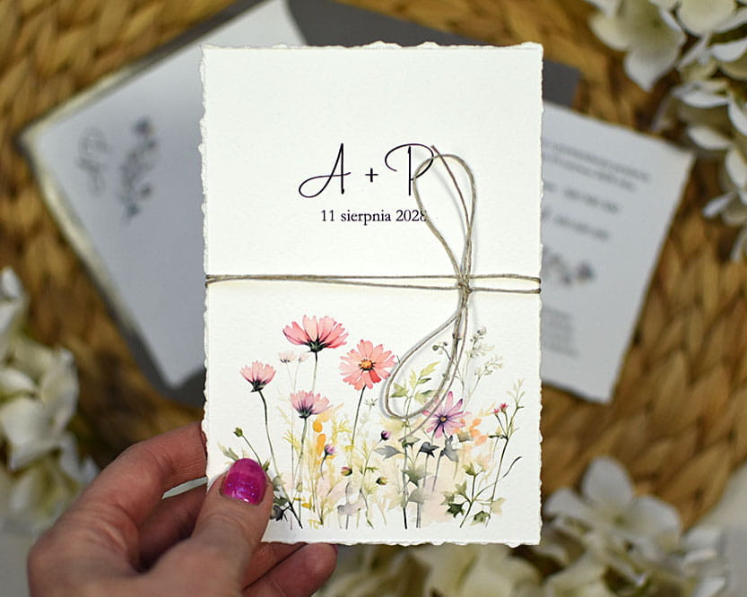 rustykalne boho zaproszenia ślubne Nadia z polnymi kwiatami i sznurkiem eko