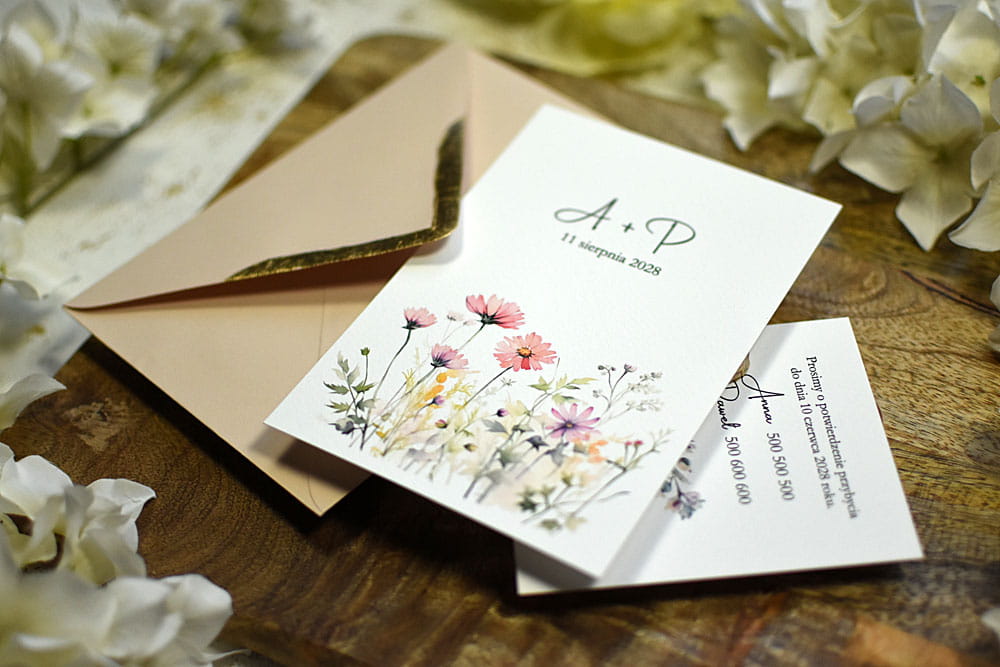 - Dodatkowa wkładka RSVP (8.5 x 10.5cm), druk jednostronny, krawędzie proste, papier biały lekko fakturowany o gramaturze 300g