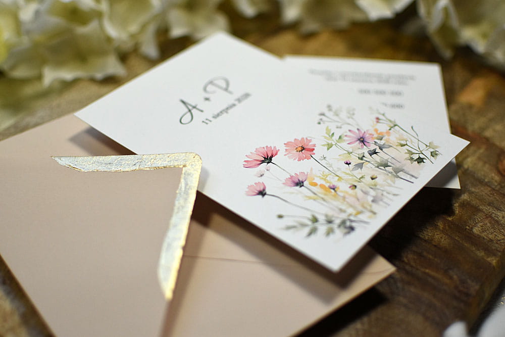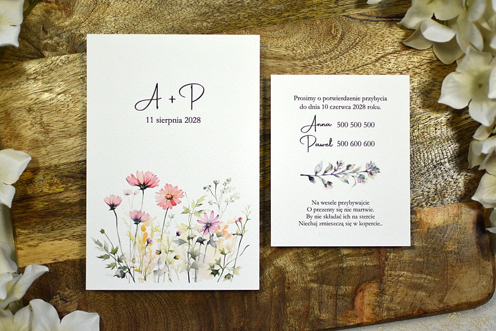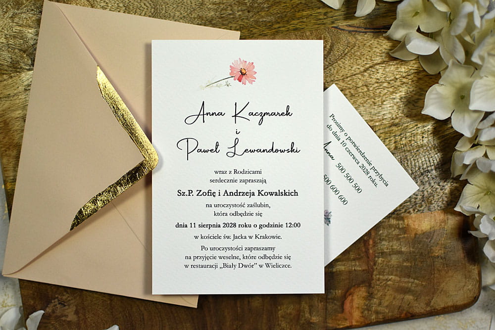 - Karta zaproszenia (10.5 x 15.5cm), druk dwustronny, krawędzie proste, papier biały lekko fakturowany o gramaturze 300g