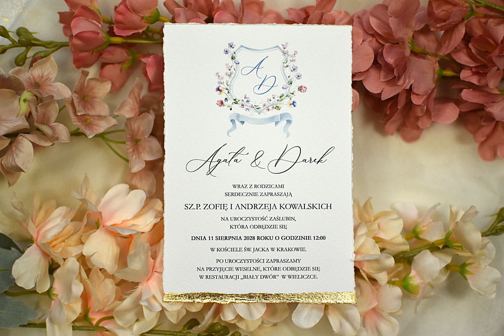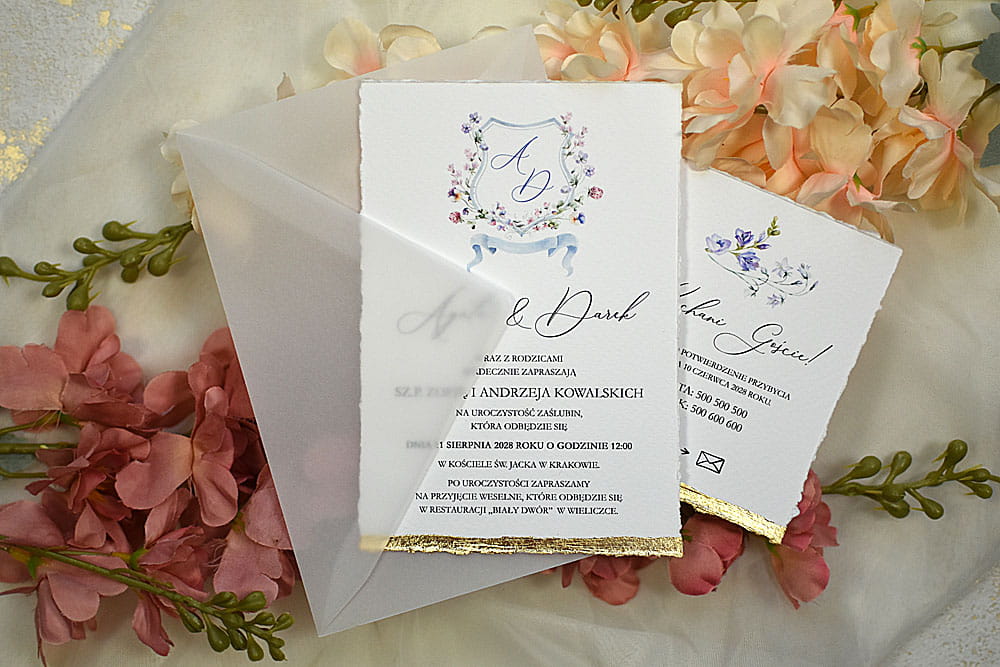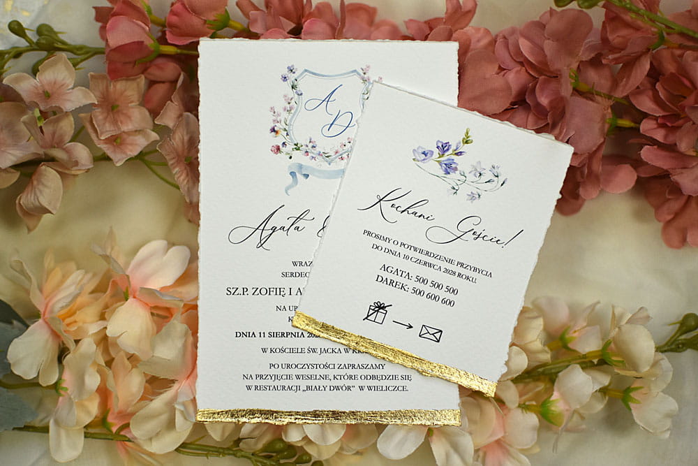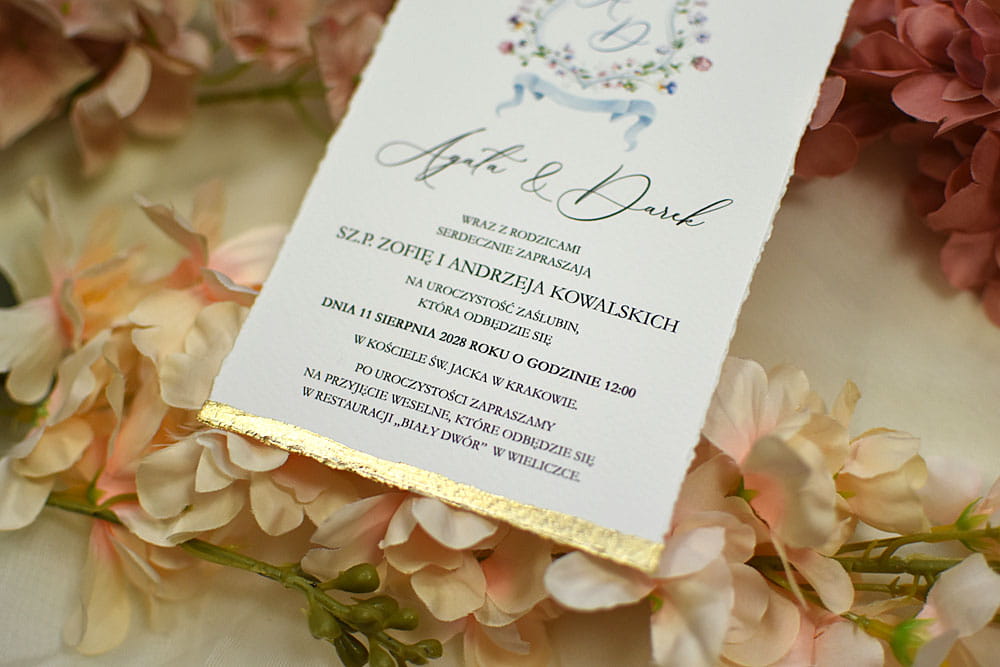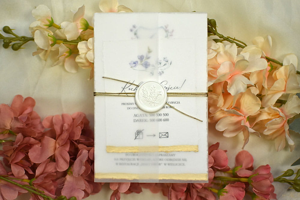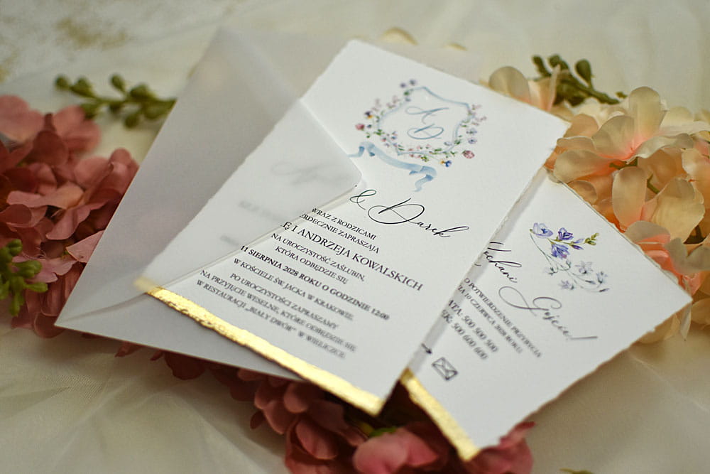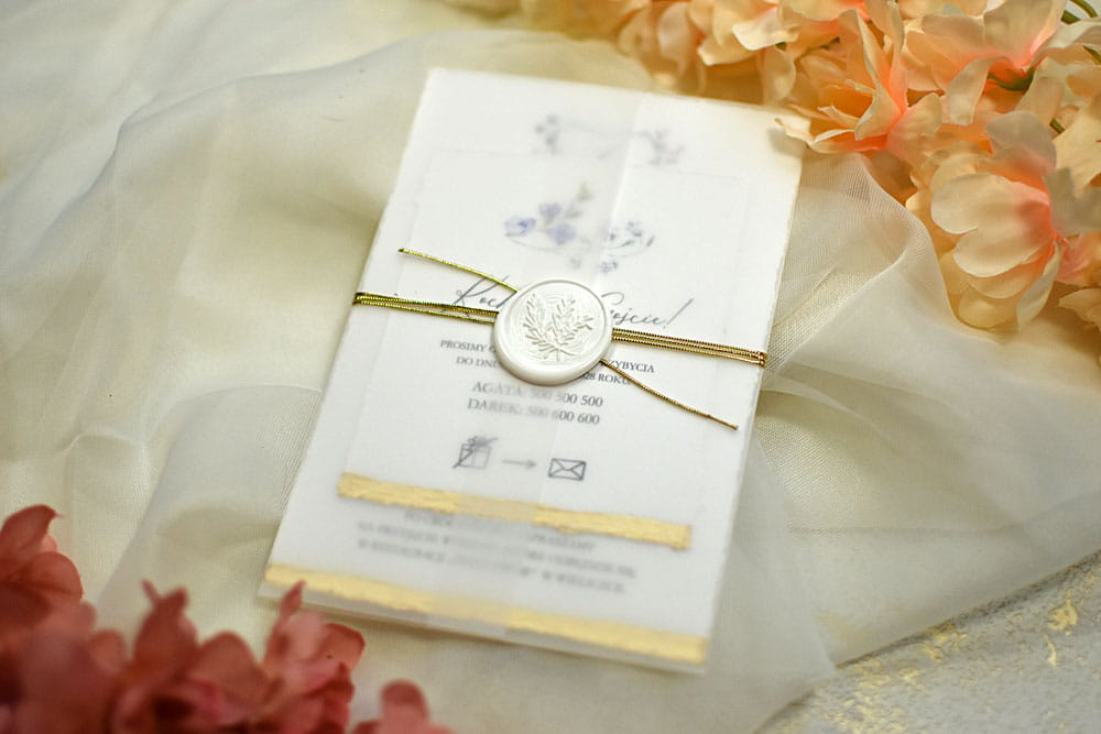 Pozostałe dodatki jak pieczęć lakowa, rwane krawędzie zaproszeń, złocenie krawędzi, sznurki, tasiemki itp. są dodatkowo płatne.