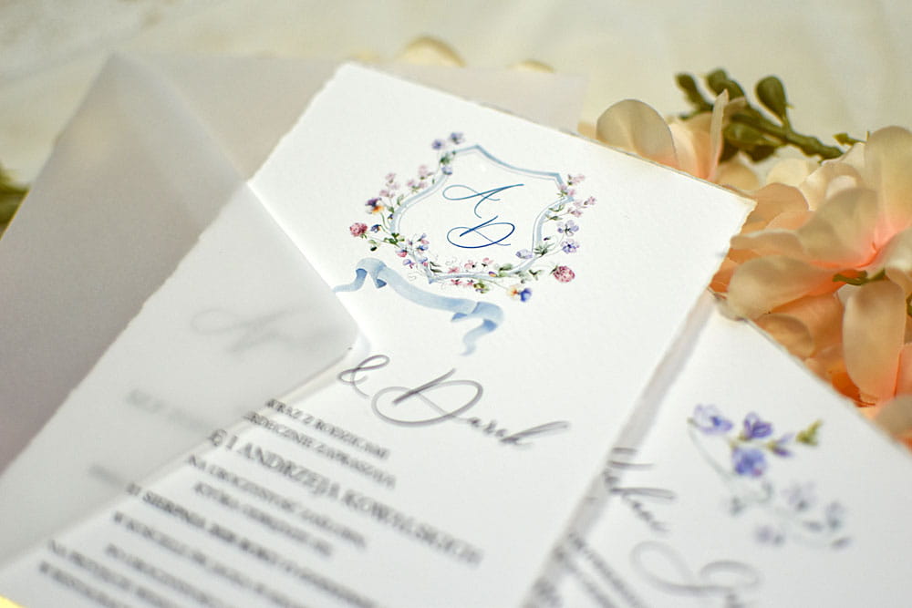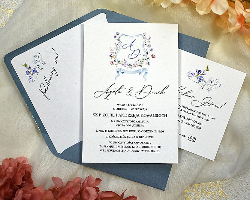 subtelny, delikatny wzór zaproszenia na ślub Petra z kwiatowymi wzorami