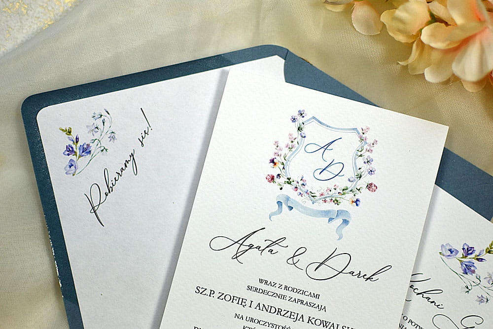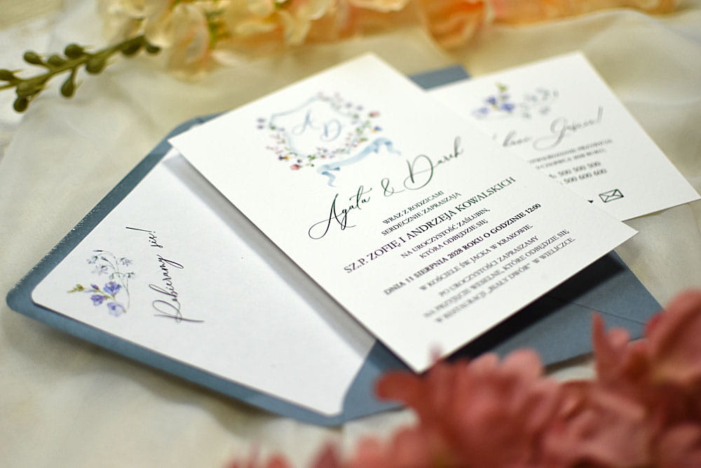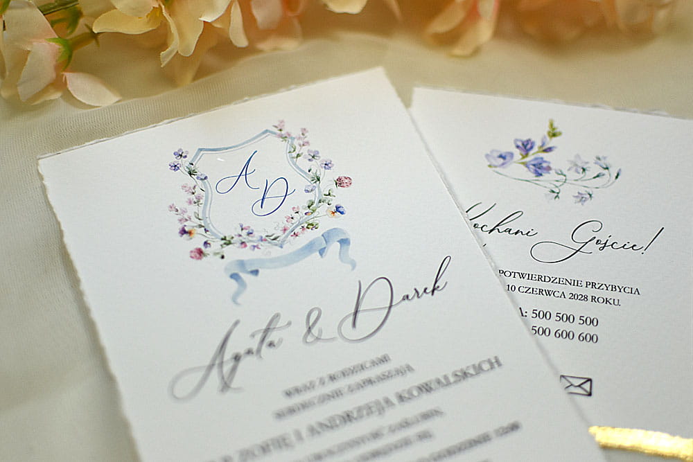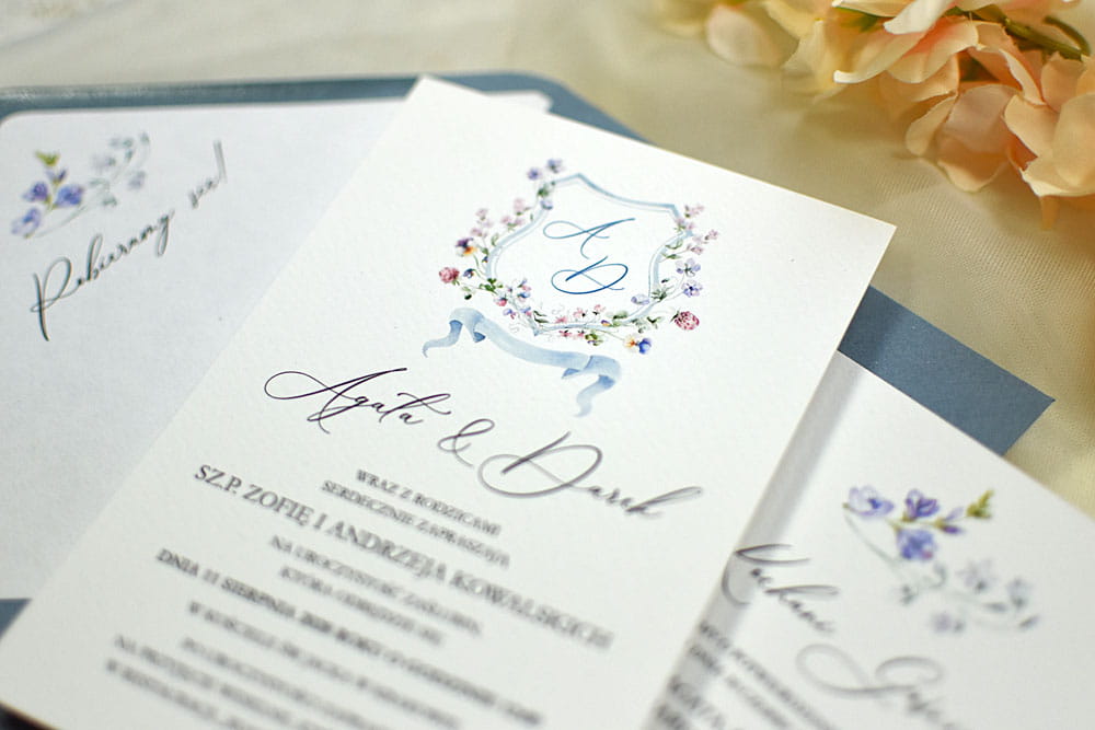 - Karta zaproszenia (10.5 x 15.5cm), druk jednostronny, krawędzie proste, papier biały lekko fakturowany o gramaturze 300g