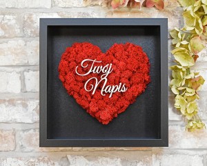 Prezent dla Rodziców od Młodej Pary - obraz z czerwonym sercem z mchu.