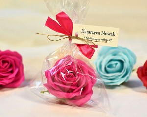 Winietka i upominek dla gości w jednym - duża róża mydlana zapakowana w woreczek celofanowy z bilecikiem.