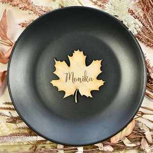 Drewniana winietka w formie liścia klonowego z wygrawerowanymi napisami. Winietki są wykonane z naturalnego drewna, na którym mogą niekiedy pojawiać się przebarwienia czy sęki, co nadaje produktowi charakteru i niepowtarzalności.