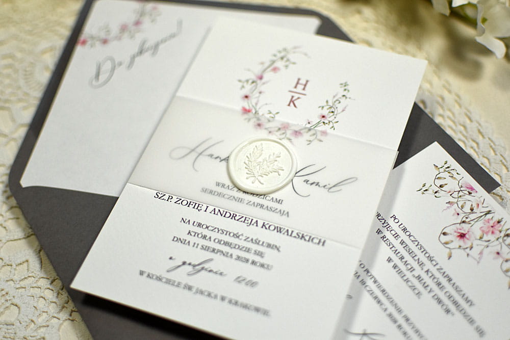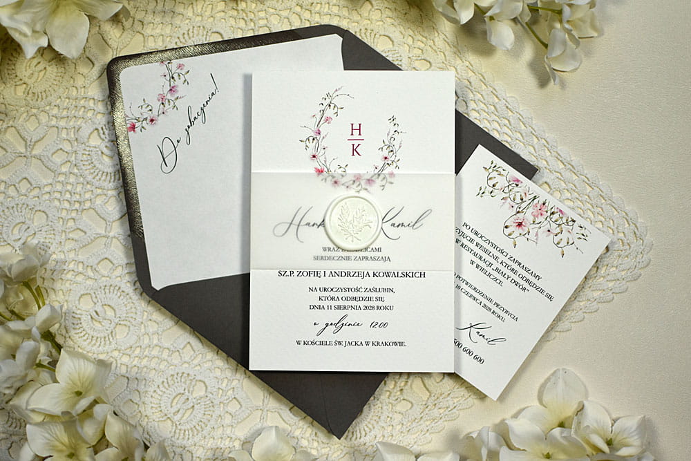 Oczaruj swoich gości eleganckimi zaproszeniami. W zależności od wybranych dodatków możesz nadać papeterii ślubnej charakter rustykalny, nowoczesny, glamour, boho czy całkowicie minimalistyczny. Przyozdób zaproszenia pieczęciami lakowymi bądź bardzo efektownym złoceniem krawędzi. Do wyboru są także sznurki, szyfonowe tasiemki czy też transparentne opaski i obwoluty z kalki. W ofercie posiadamy także bogatą paletę kolorowych kopert. Wszystkie tasiemki i sznurki są już zawiązane!