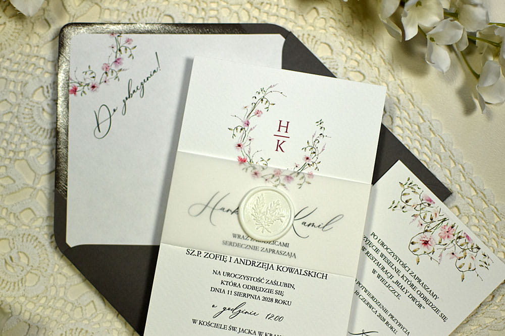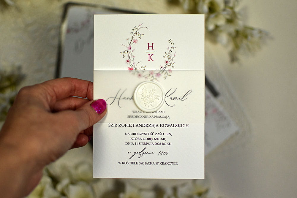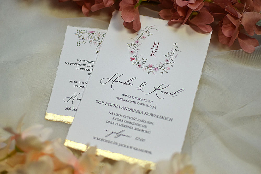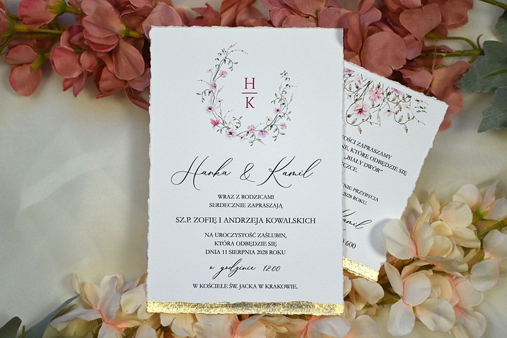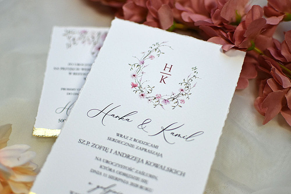 zaproszenia ślubne Maja z delikatnym różowym kwiatowym wiankiem