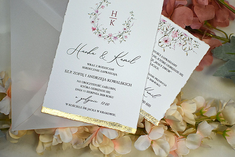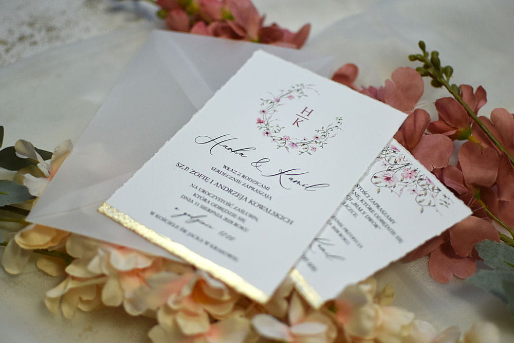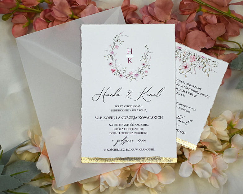 Pozostałe dodatki jak pieczęć lakowa, rwane krawędzie zaproszeń, złocenie krawędzi, sznurki, tasiemki itp. są dodatkowo płatne.