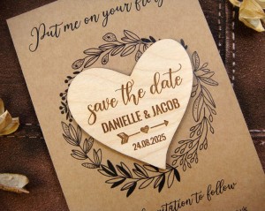 Chcecie uprzedzić gości, żeby zarezerwowali czas na Wasz ślub za kilka miesięcy? Wyślijcie im Save the Date w postaci drewnianego magnesu na lodówkę. Jest możliwość domówienia kartki z nadrukiem i koperty jak na załączonych zdjęciach. Wszystkie napisy mogą być w języku polskim. Magnesy są wykonane z naturalnego drewna, na którym mogą niekiedy pojawiać się przebarwienia czy sęki, co nadaje produktowi charakteru i niepowtarzalności.