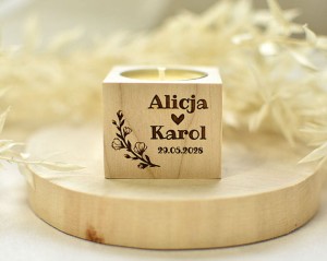 Zaskoczcie gości niecodziennym upominkiem - przepięknym drewnianym świecznikiem z wygrawerowanym okolicznościowym napisem. Dopełnieniem całej kompozycji jest pachnąca świeczka - wkład tealight wykonany przez nas z wosku sojowego. Świecznik jest wspaniałym ekologicznym prezentem, który przez długie lata będzie cieszyć gości. Po wypaleniu się świeczki można włożyć tam następny standardowy tealight.