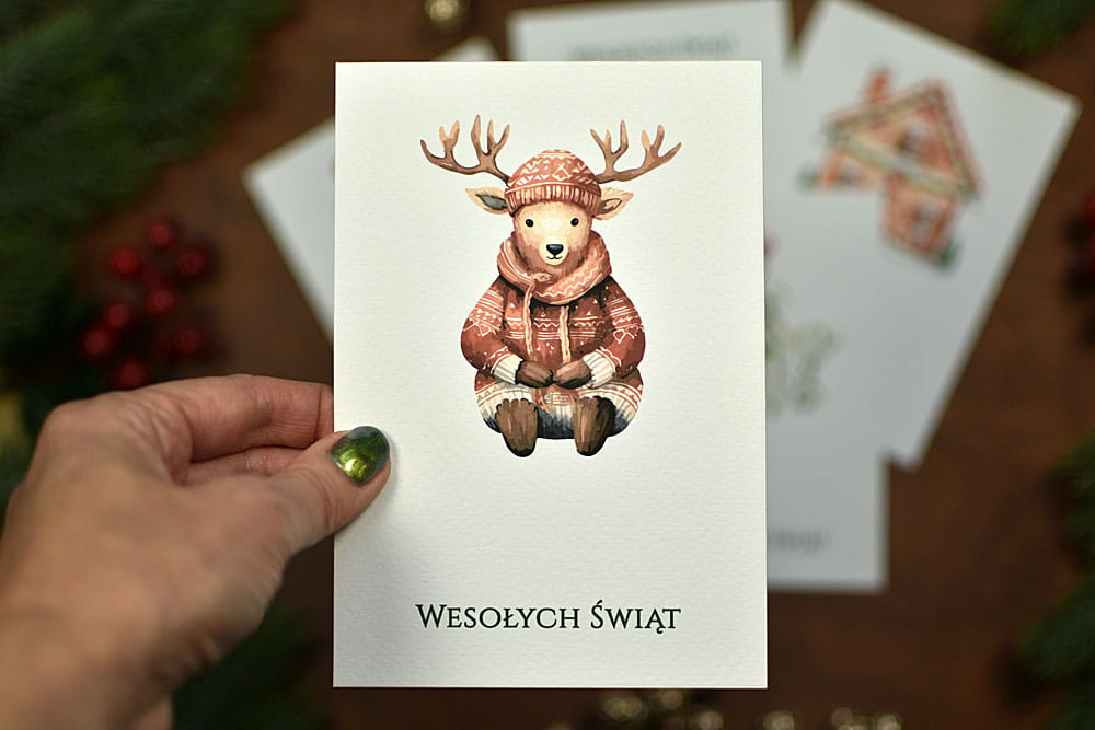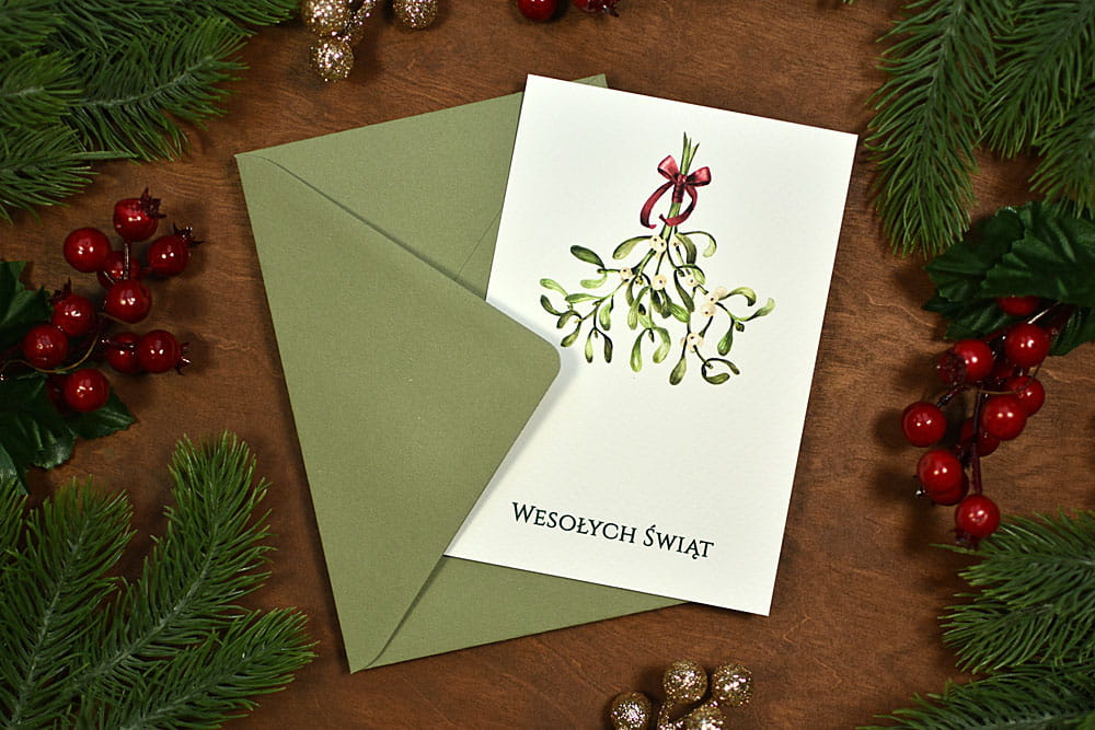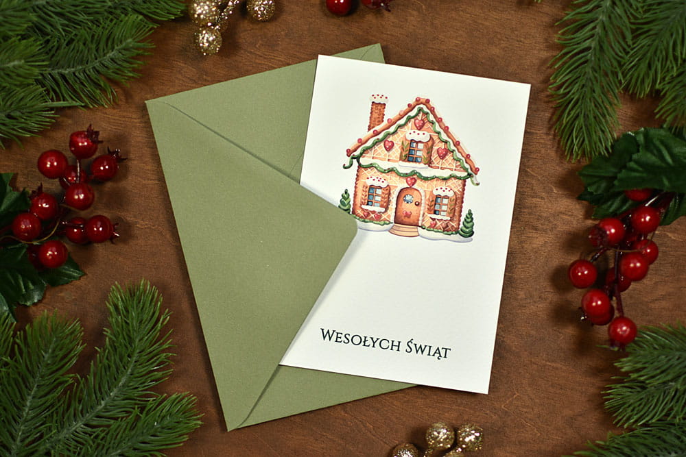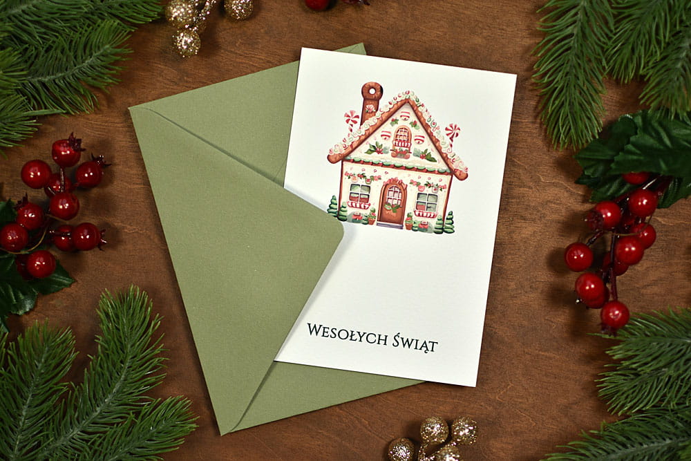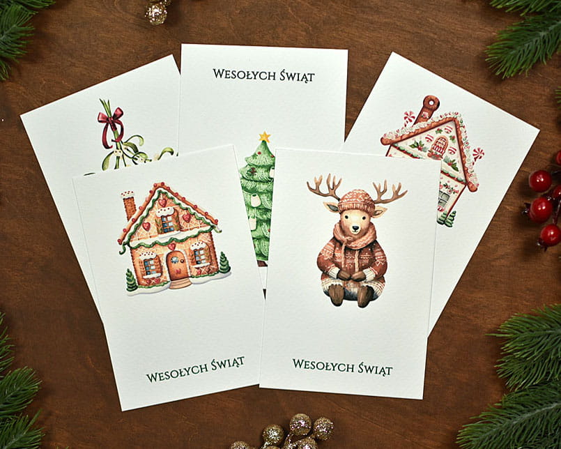 Bardzo klimatyczny zestaw świątecznych, bożonarodzeniowych kartek, ozdobionych motywami pierników, jemioły, reniferów czy choinek. Kartki można spersonalizować, można podać własny tekst, a nawet dodać logo. Dopełnieniem zestawu są wykonane z papieru ekologicznego koperty w kolorze zielonym.